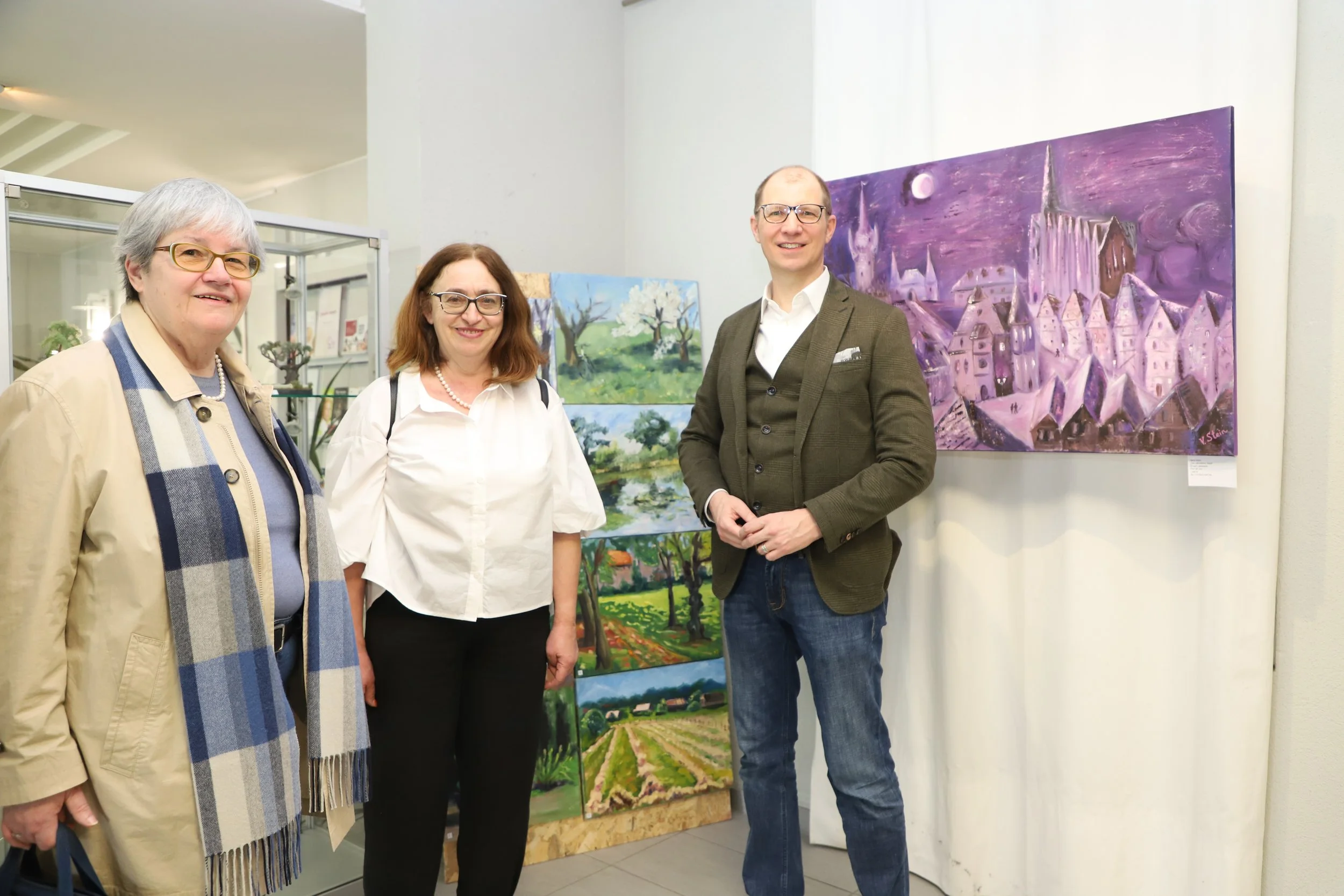 Diesen Kontrast zwischen realen Motiven und mystischen Einflüssen greift auch Landrat Jan Weckler in seinen einleitenden Worten auf: „In Ihren Gemälden bilden Sie ausdrucksstark und mit kraftvollen Farben die Region ab. Gleichzeitig übersehen Sie dabei nicht den Blick für die vielen Details. Das zeigt sich in Ihren Landschaftsbildern ebenso, wie in Ihren Werken der Friedberger Altstadt mit ihren Gesimsen, Hauserkern und Fassaden. Hier kommt auch Ihr im Ausstellungstitel genannter mystischer Aspekt zum Tragen. Sie hauchen den Wasserspeiern und Gargoylen der Stadtkirche Leben ein und lassen sie durch die Straßen wandern. In gewisser Weise treten Sie damit in die Tradition der mittelalterlichen Kirchenbaumeister, die ihre Werke und Bilder sprechen ließen in einer Zeit, als die wenigsten lesen und schreiben konnten.“ Vera Steins Werke strahlten eine Lebendigkeit aus, regten zum Träumen an und beflügelten die Vorstellungskraft, so Jan Weckler, der der Künstlerin für die Gelegenheit dankt, ihre Werke im Kreishaus auszustellen.