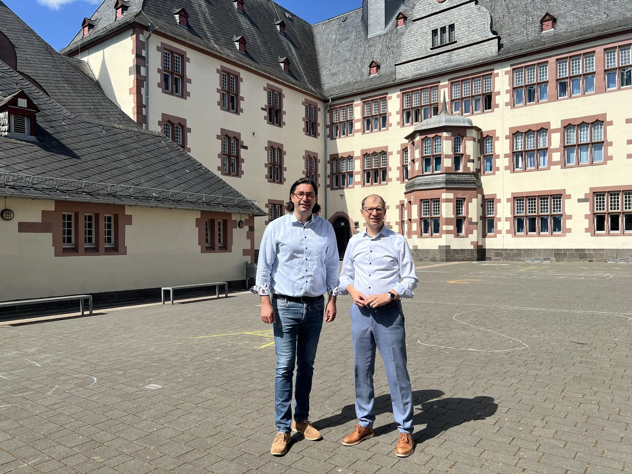 Landrat Jan Weckler (rechts) und Friedbergs Bürgermeister Kjetil Dahlhaus einigen sich auf die Fortsetzung eines Raum-Provisoriums für die Augustinerschule auf dem Goetheplatz. So wollen sie möglichst vielen Schülerinnen und Schülern den Besuch der Einrichtung ermöglichen, bis der derzeit geplante Erweiterungsbau steht.