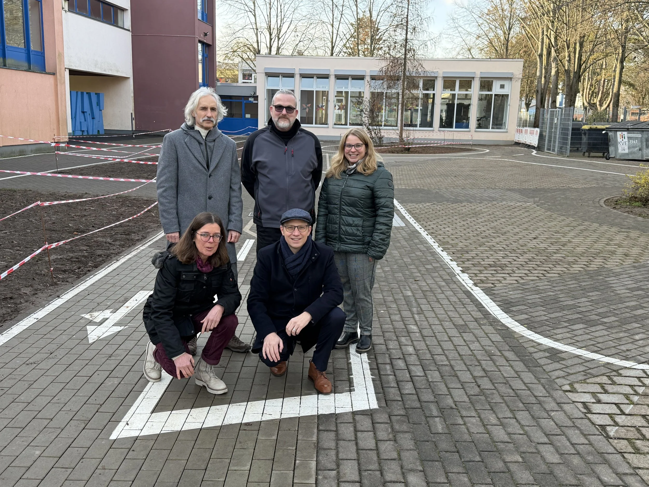 Die Verkehrsführung wurde mit der Polizei abgestimmt, um zu gewährleisten, dass sie für Kinder sicher ist und eine geeignete Lernumgebung für die Verkehrsschule darstellt. Um die Nutzung der Fläche zu verbessern, wurde die Pflasterfläche rund um den Fußballplatz an mehreren Stellen um vier bis fünf Zentimeter angehoben. Diese Anpassungen waren notwendig, um die ordnungsgemäße Nutzung der Fläche zu sichern und die Pfützenbildung zu verhindern. Darüber hinaus wurden offene Flächen abgetragen, mit Mutterboden aufgefüllt und im Frühjahr soll dann alles noch besät werden.
