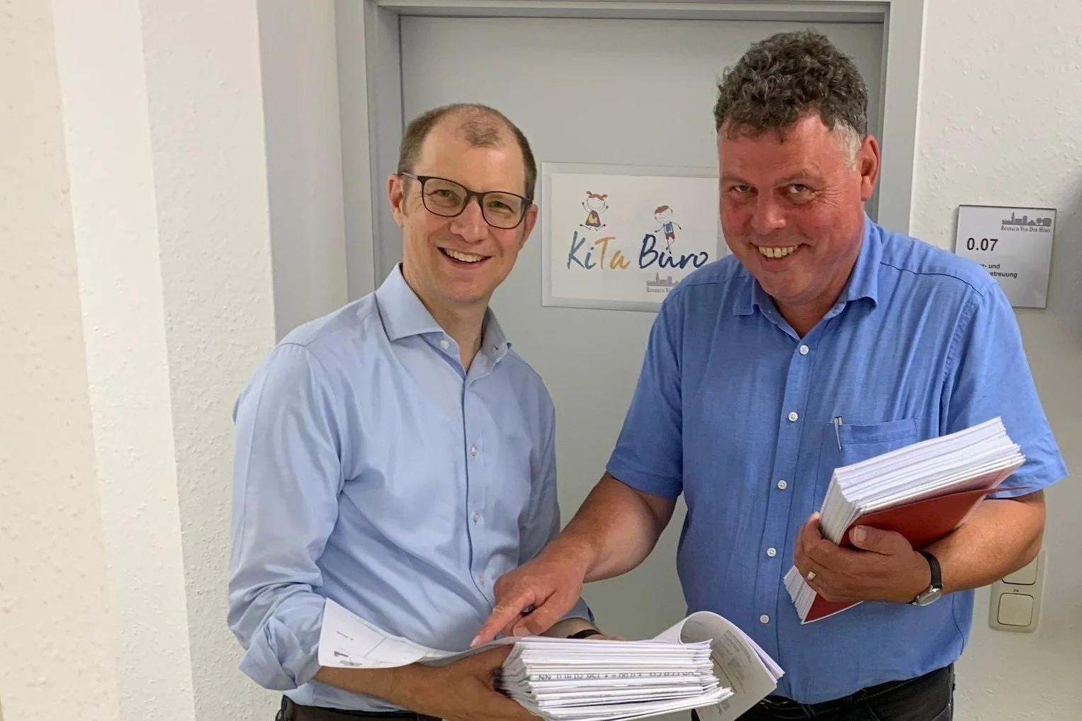 Der Rosbacher Stadtteil Rodheim bekommt eine neue Kindertagesstätte: Landrat Jan Weckler hat nun die Baugenehmigung an Bürgermeister Steffen Maar übergeben. Geplant ist der Neubau einer achtgruppigen Kita für unter und über Dreijährige.